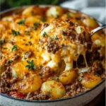I’ve been making this cheesy ground beef and potato casserole since college: it’s the kind of dish that fills the kitchen with a warm, savory smell and feeds a crowd with almost no fuss. Think of it as layered comfort—golden thin potatoes, savory browned beef and onions, a creamy blanket of mushroom soup and milk, and a gooey cheddar top. It’s ideal for weeknights when you want one-pan simplicity, potlucks, or when you need a hearty dish that kids and adults both reach for. If you like easy, oven-baked potato casseroles, you might also enjoy the flavor pairing in Cheesy Ranch Potatoes with Smoked Sausage for another crowd-pleasing option.