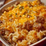 A comforting one-pan casserole with browned beef, uncooked rice, and melty cheddar, perfect for busy weeknights.