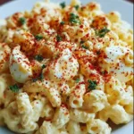 A creamy, tangy pasta salad inspired by classic deviled eggs, perfect for potlucks and summer picnics.