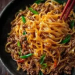 Start by boiling noodles so they’re ready when the sauce is done. Brown the ground beef and drain excess fat for a cleaner sauce. Sauté garlic and ginger briefly to release aroma, then add the sweet-savory sauce and let it reduce. A cornstarch slurry thickens the sauce quickly so it clings to the noodles. Finally, toss everything together and finish with green onions and sesame seeds for brightness and texture.