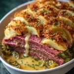 A comforting casserole featuring layers of tender cabbage and salty corned beef, topped with melty Irish cheddar and a crunchy oat breadcrumb crust.