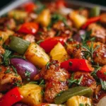 A quick and easy weeknight meal featuring tender chicken roasted with bell peppers, red onion, and juicy pineapple, all glazed in a sweet and savory marinade.