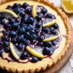 A bright tart like this balances sunny lemon with bursts of fresh blueberry and always feels like a small celebration. I make it when friends drop by for afternoon tea or when I want something that looks special but comes together without fuss. The filling is a lemon custard studded with whole blueberries, baked until the edges set and the center still jiggles slightly — then chilled so each slice cuts cleanly.