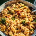 This recipe hits several sweet spots. It’s quick (start to table in roughly 25–30 minutes), budget-friendly (simple pantry staples), and kid-approved — the small, pasta-like orzo is familiar and easy to eat. Because everything cooks in one pot, the orzo absorbs the turkey’s juices and tomato flavor, which makes the dish richer than simply tossing pasta and sauce together. Make it on hectic weeknights, for a casual family dinner, or for meal-prep lunches that reheat well.