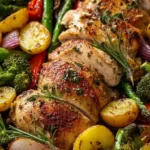A quick and easy one-pan meal featuring tender chicken, caramelized baby potatoes, and mixed vegetables roasted in flavorful garlic butter.