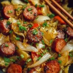 A quick and satisfying one-pan stir fry featuring savory sausage, crisp cabbage, and vibrant bell peppers.