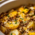 I grew up on one-pot dinners that solved weeknight chaos: this crockpot hamburger potato casserole is one of those miracles. It’s a layered, cheesy slow-cooker bake that turns simple pantry staples—ground beef, sliced potatoes, canned soup, and cheddar—into a family-pleasing, hands-off meal. I like it because it’s forgiving, budget-friendly, and the slow cooking builds a cozy, homey flavor you don’t get from oven-baked versions. If you enjoy slow-cooker comfort food, you might compare notes with the recipe I referenced from Savor & Simple’s crockpot casserole when you want variations or timing tips.
